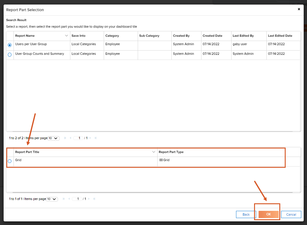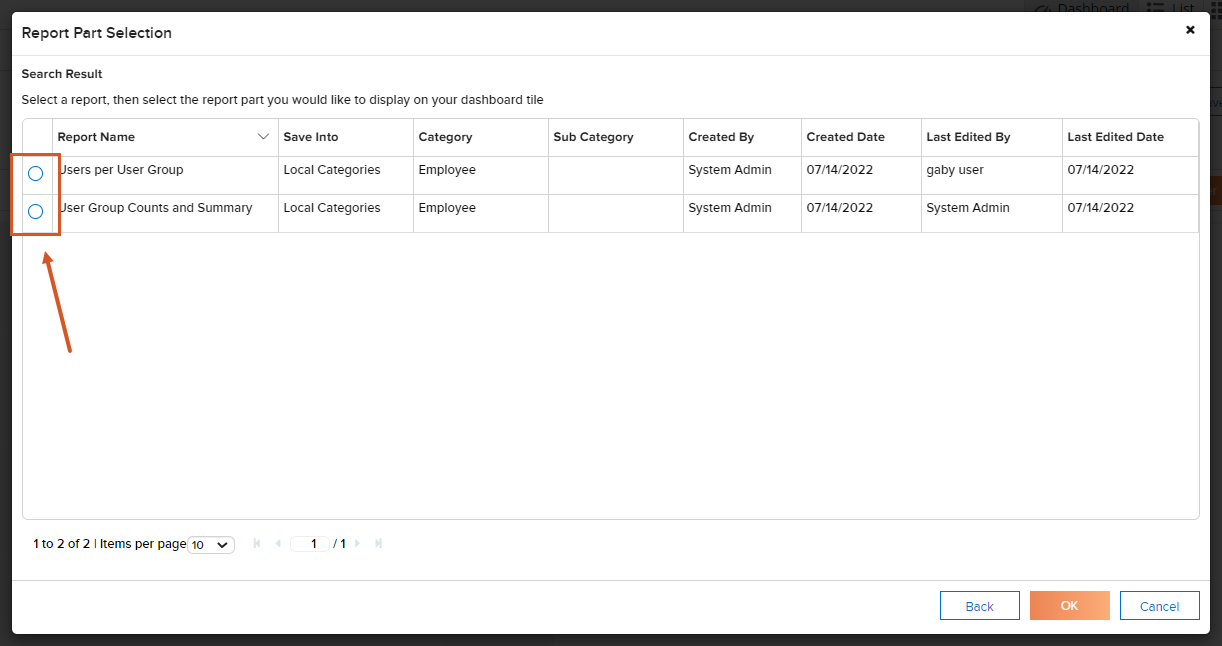 - Once you have selected a report, a list of report parts for that report will appear beneath the report list. Select the report parts you would like to have added to your dashboard by clicking on the circle icon next to the report part title. Click "Ok" to save your selection.