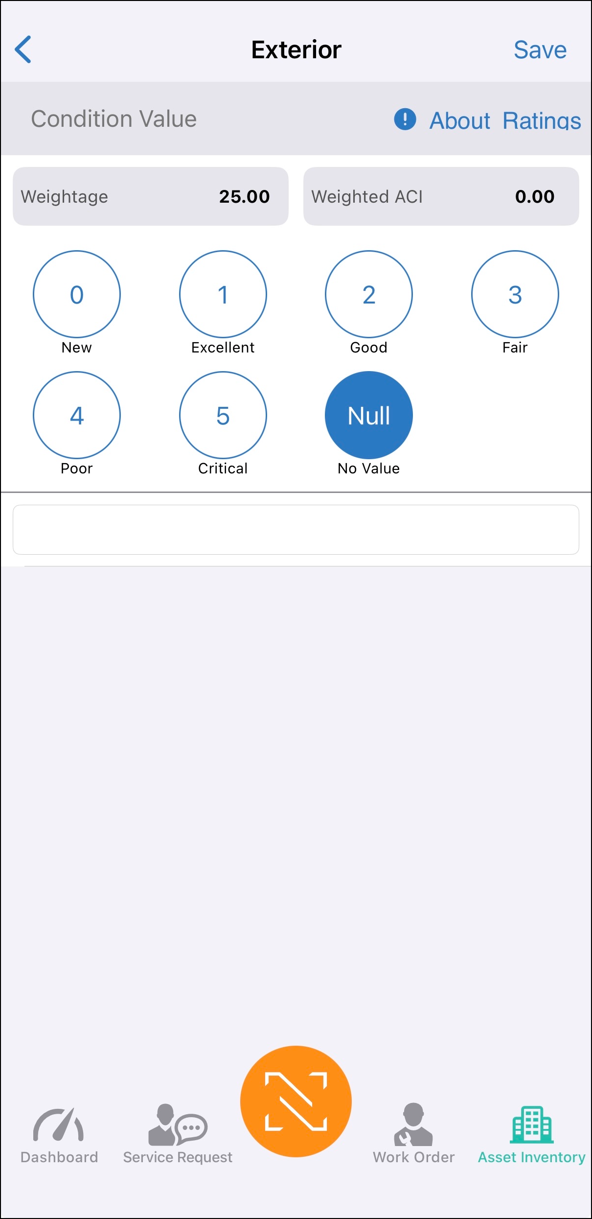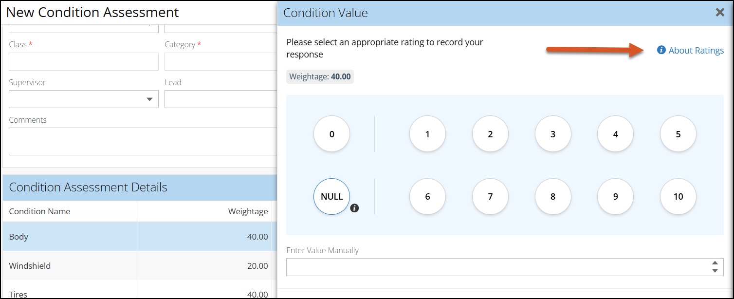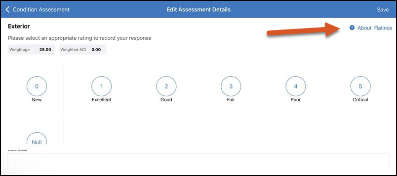 When filling out a condition assessment, users, will be able to see reference images and rating descriptions by clicking About Ratings when entering scores for a CA type field.