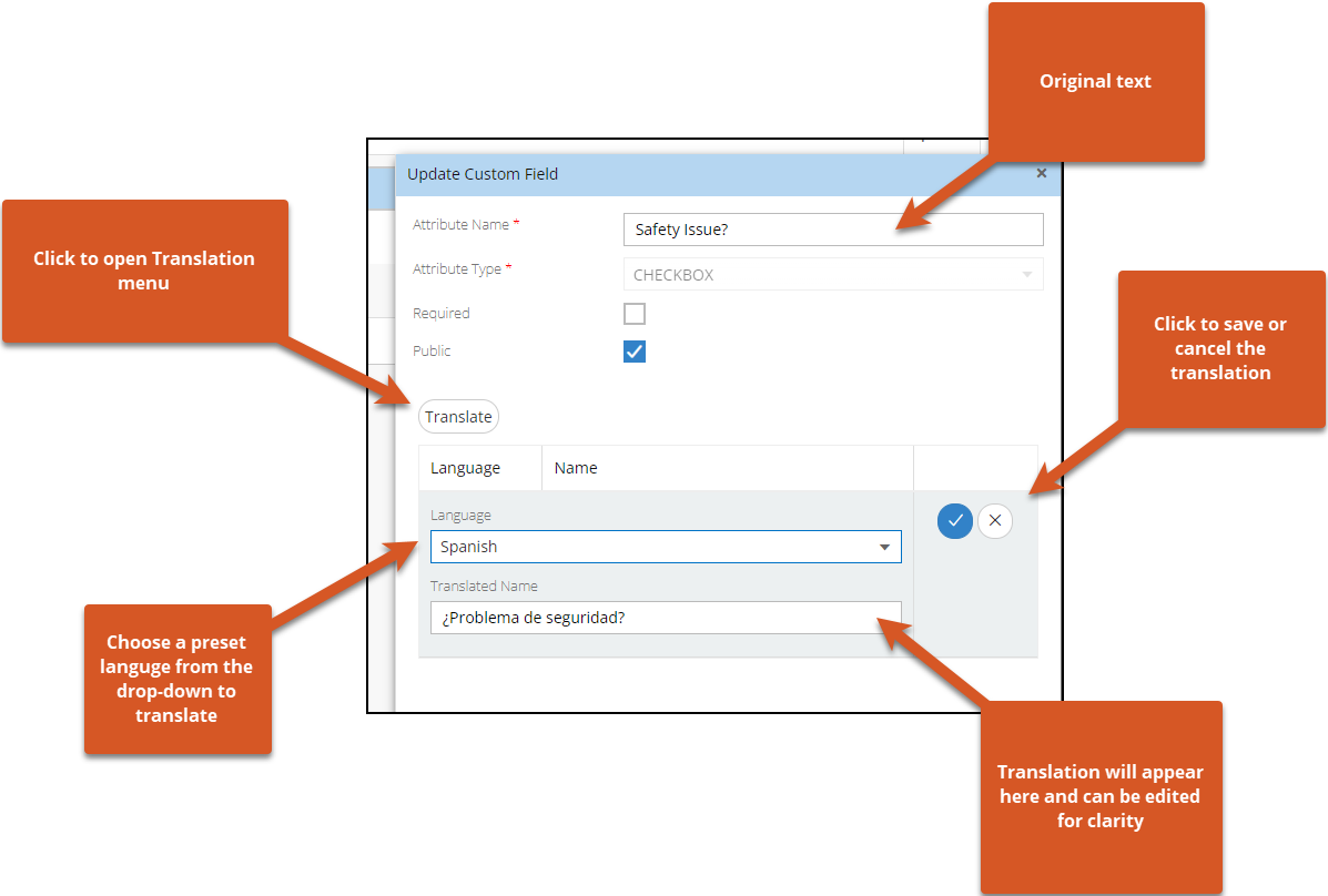 - A menu will appear where you can view editable information for the custom field. Click the "Translate" button to open the Translate menu (shown to the right).