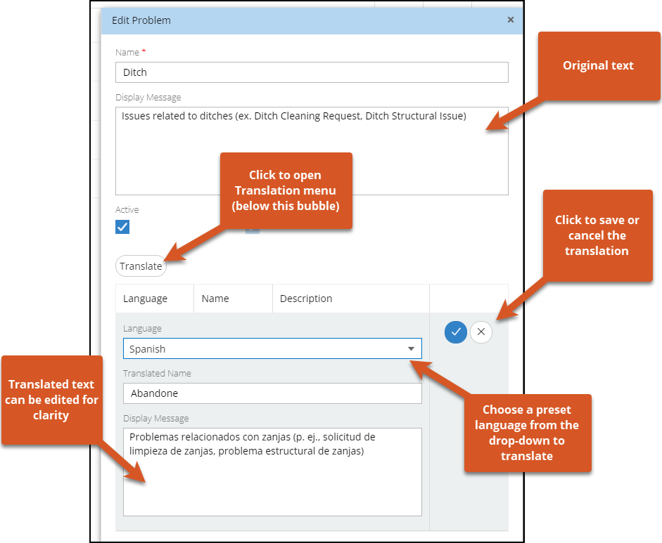 - A menu will appear where you can view editable information for the problem. Click the "Translate" button to open the Translate menu (shown to the right).