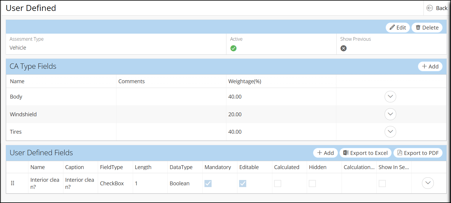 - Weightage (weightage of field; how much the field's score contributes to the asset's ACI): Uses a 0-100% scale. All CA type fields should add up to 100%.