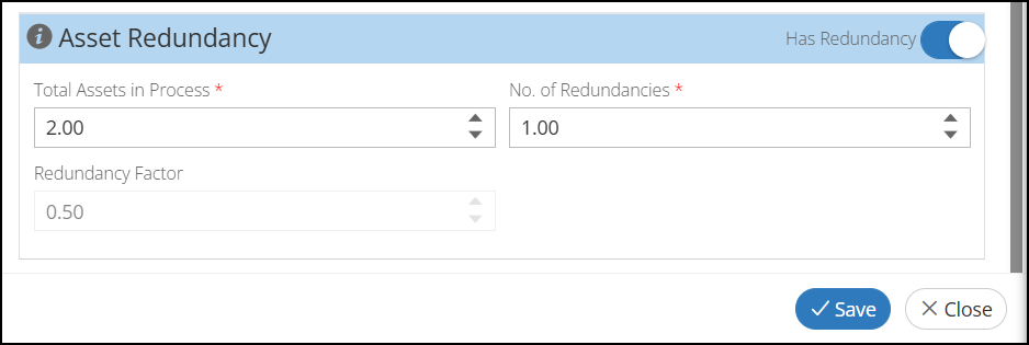 - No. of Redundancies: Refers to the total number of assets that are considered spares within the identified process.
