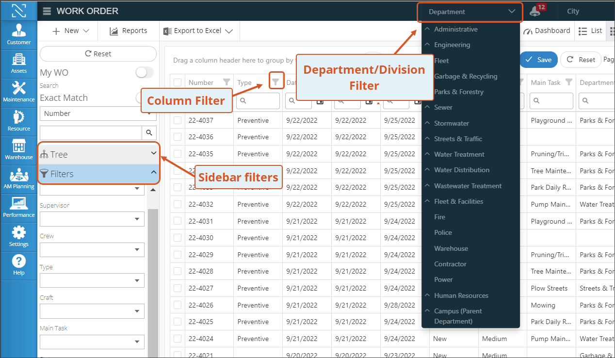 In the image below, the 3 different types of filters are shown. While the image displays where filters are available for the WO module, filters are located in the same place regardless of the module you are viewing.