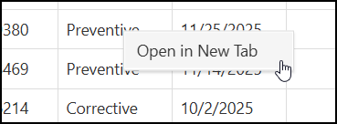 Note: Open in New Tab for grid view is currently only available for the Service Request, Work Order, and Preventive Maintenance modules.