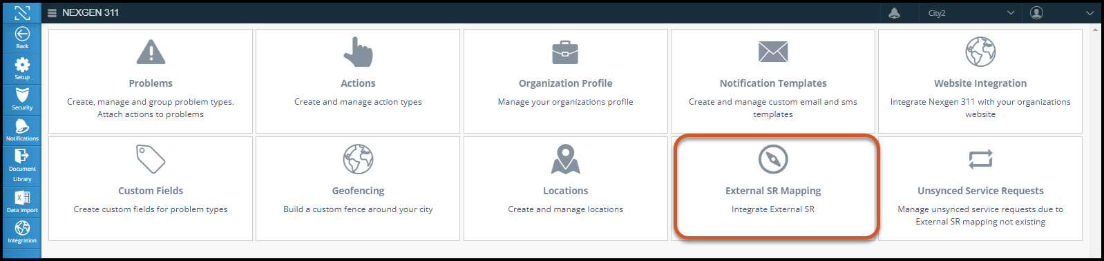 Mapping external SR types to internal SR types is useful if you would like SRs that are being pushed from the 311 Portal to your NEXGEN site to auto populate certain information. To map this data: