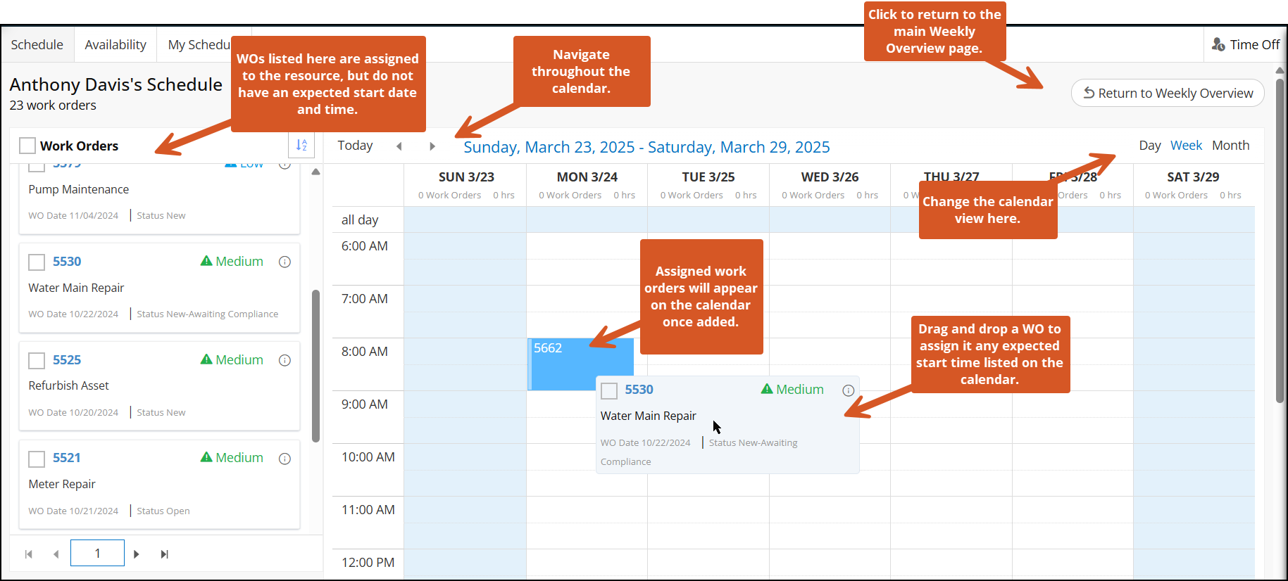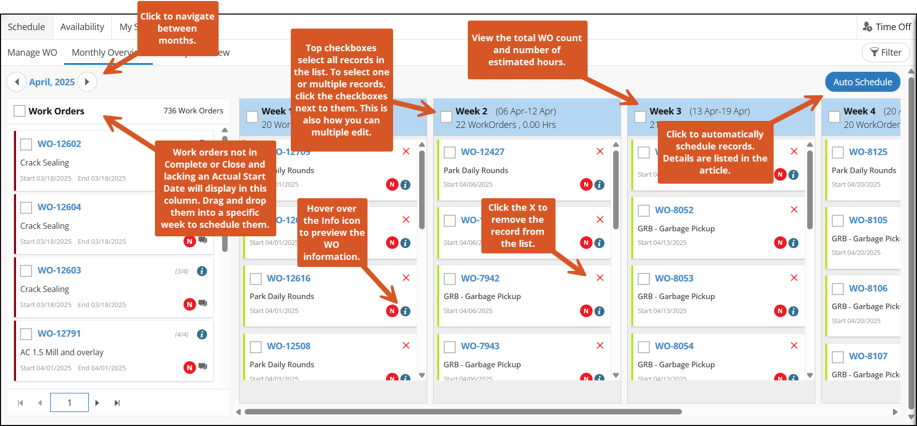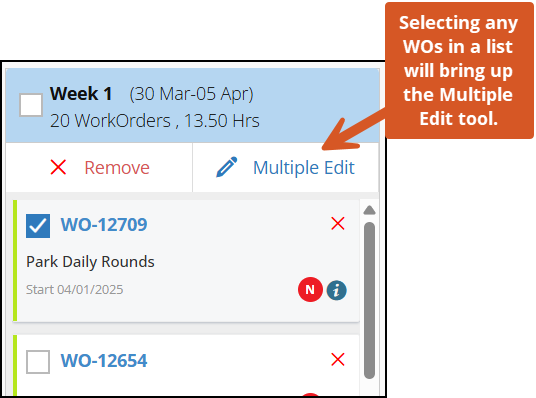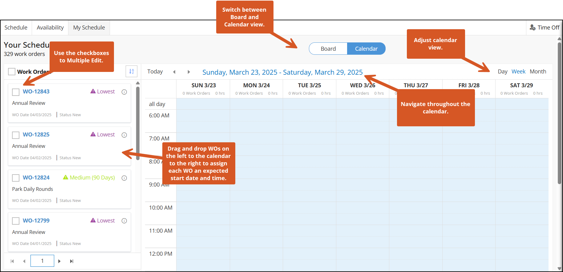 Drag and drop from the list of WOs on the left to the calendar on the right to schedule expected start dates and times for those WOs. You can also click the checkboxes next to one or multiple WOs to Multiple Edit.