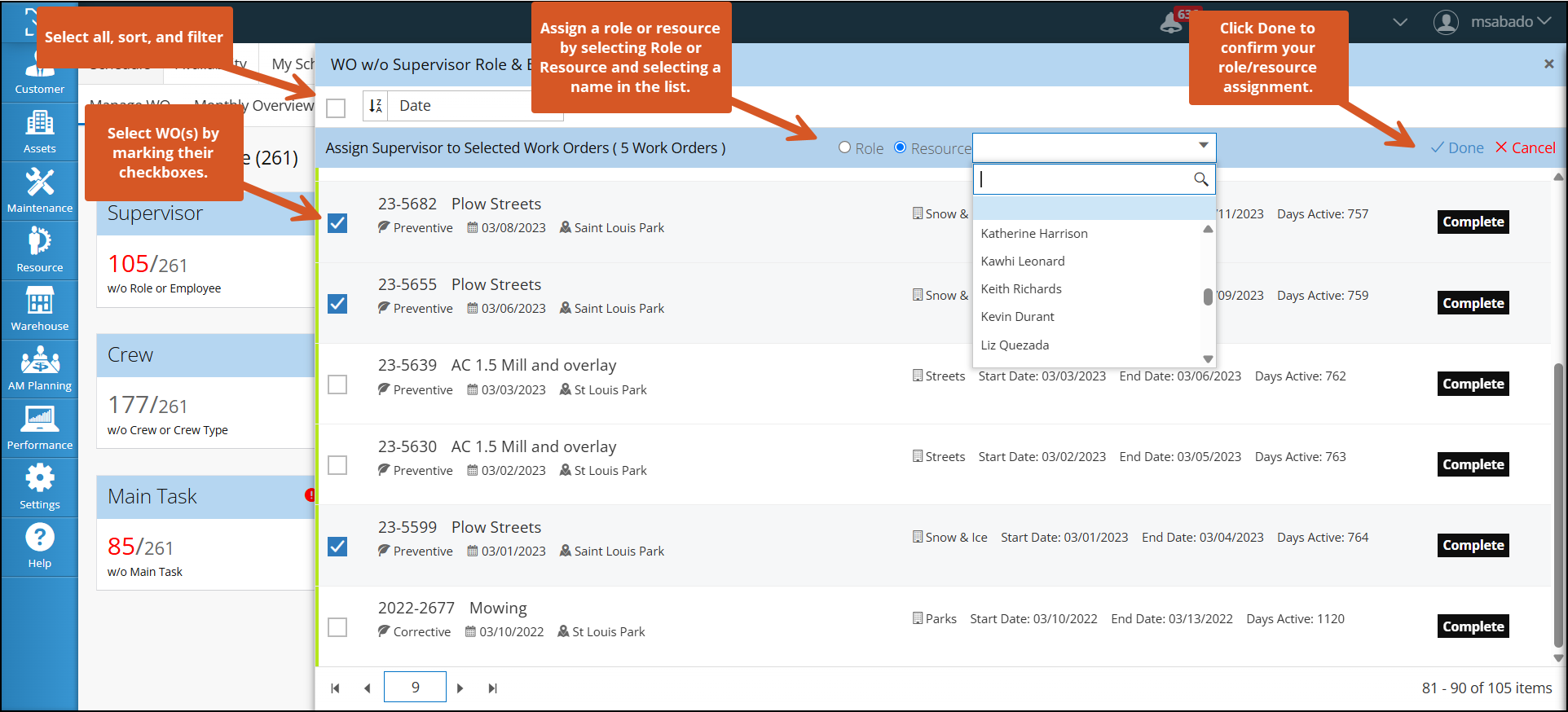 Click on any of the buckets to resolve the applicable field. For example, if you need to resolve work orders that do not have a supervisor assigned, you can click on the Supervisor bucket to mass assign work orders to roles or resources.