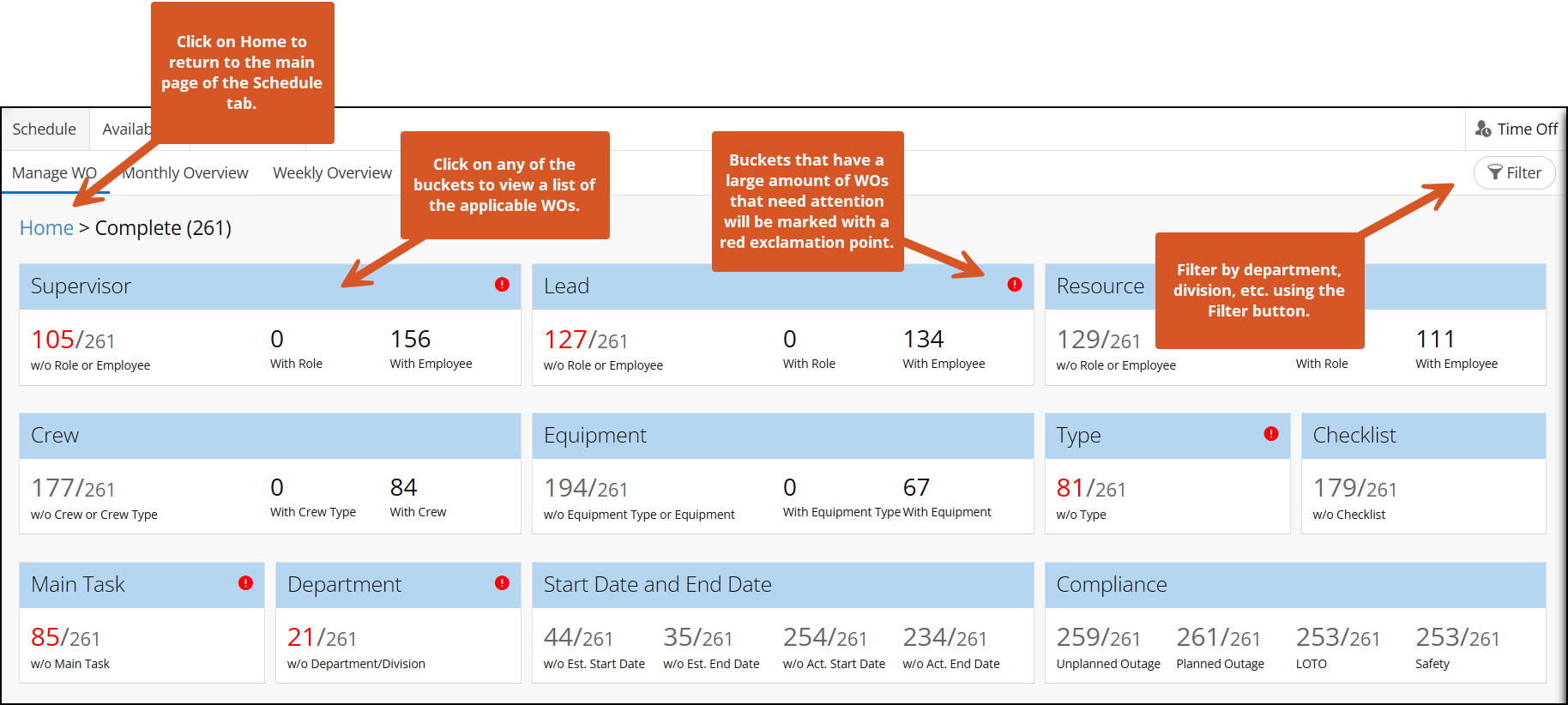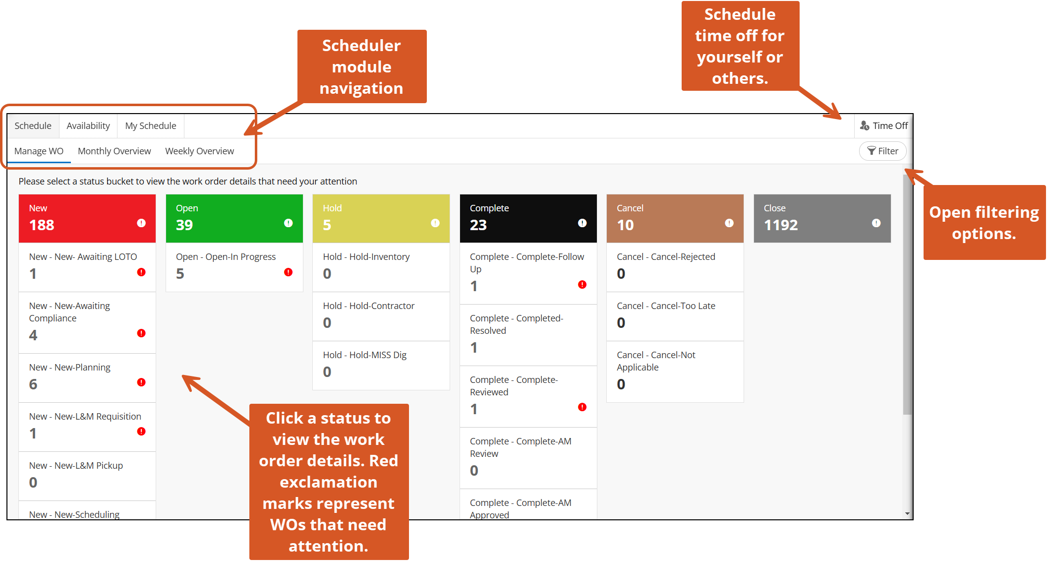 The Manage WO tab is used to see work orders in given statuses as well as work orders that might need attention due to missing data or other related items. Click on a status bucket to see a list of relevant work orders. Work orders that need attention are marked with a red exclamation point.