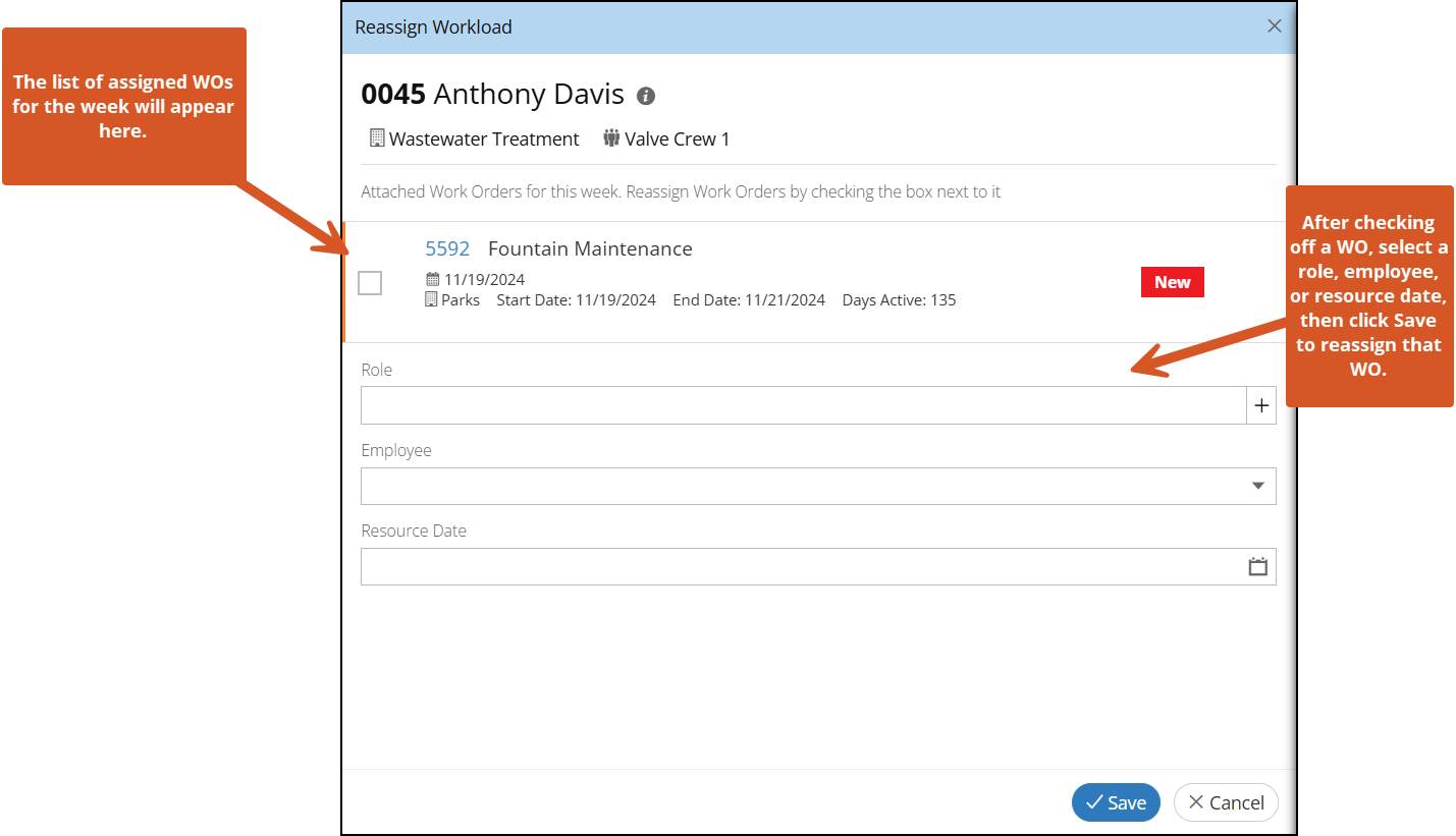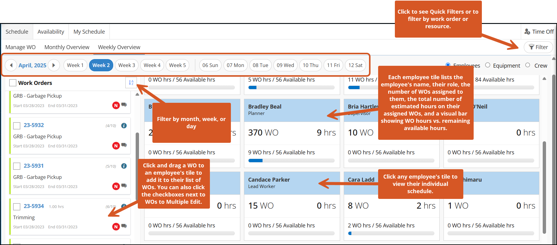 View an employee's schedule by clicking their employee tile. This will bring up a calendar where you can designate expected start dates and times for assigned WOs that do not have an expected start date and time.