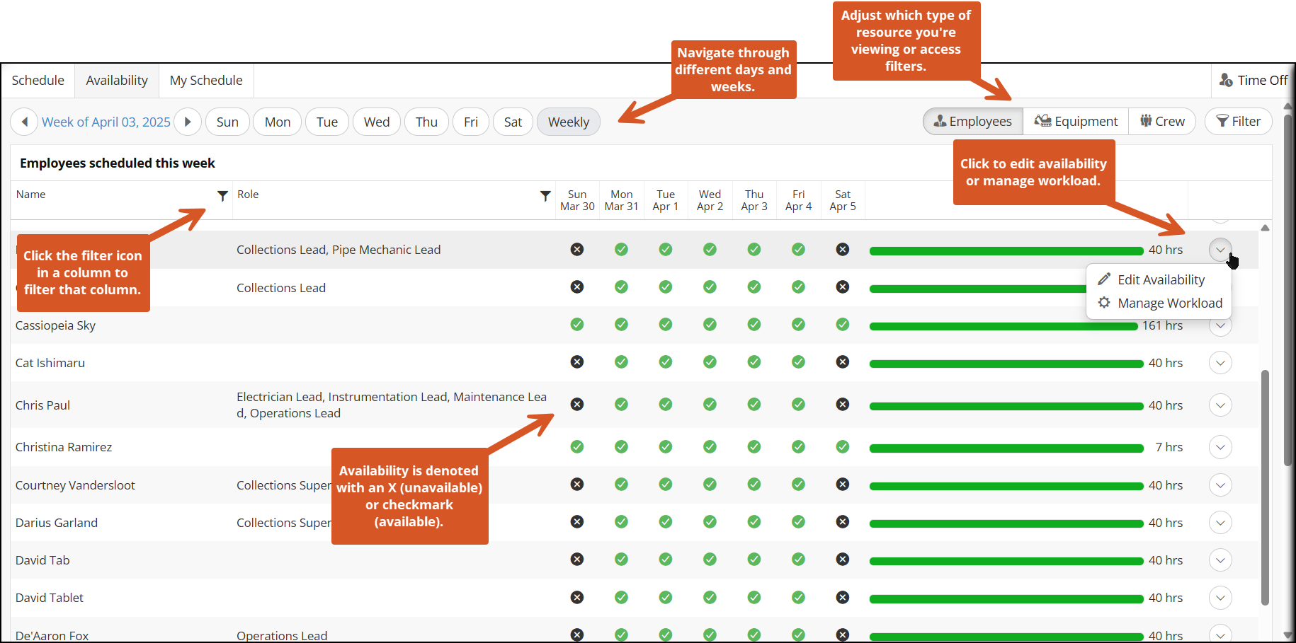 The Availability tab gives an overview of resource availability. From this view, users can also edit employees' availability or manage their workloads using the Manage Workload functionality.