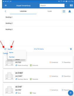 Back Click on Asset Inventory module from the left side menu Tap on any listed location or class category Tap on Name and choose Number Tap on the Sort icon next to Number
