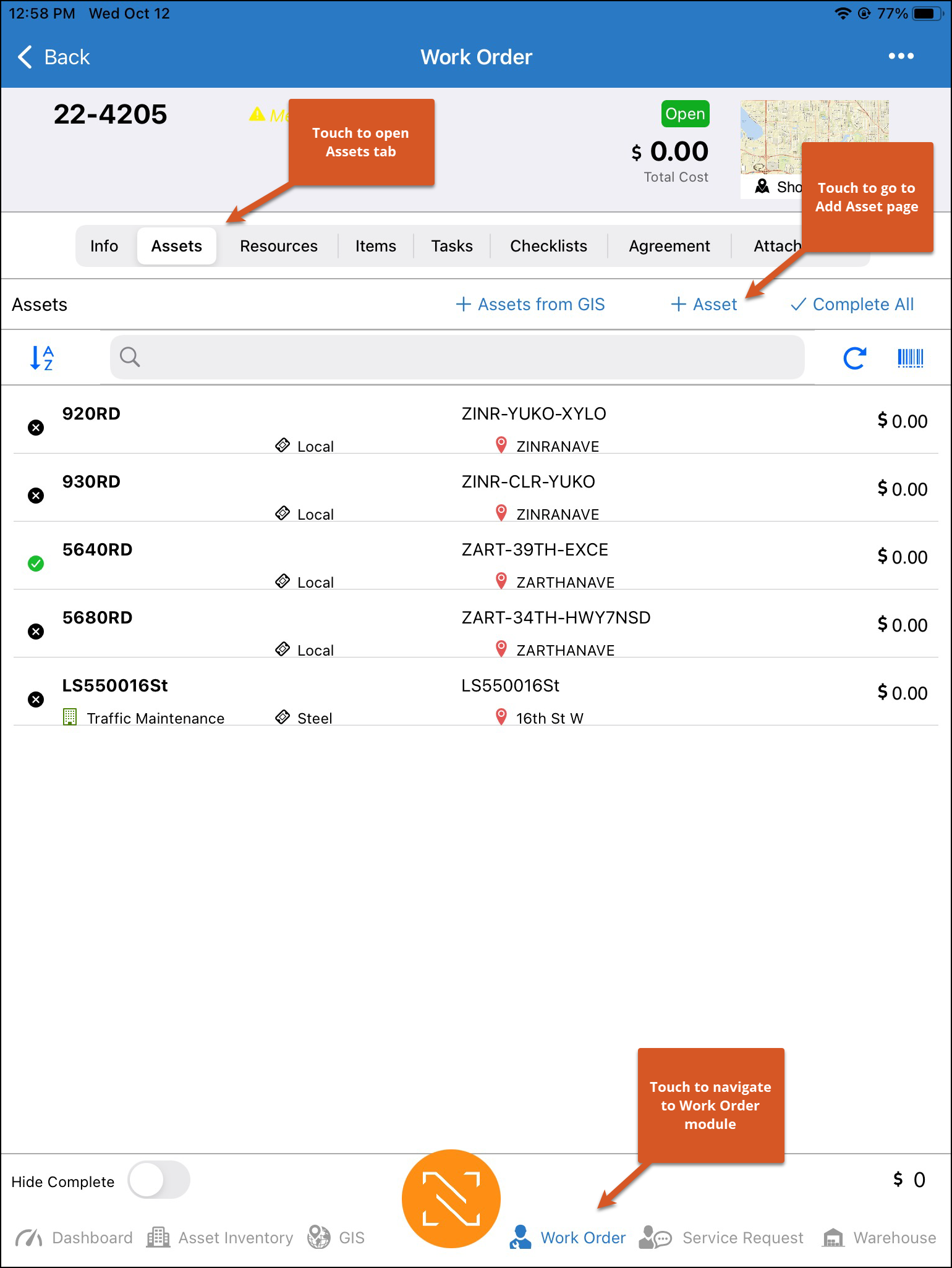 - Open the Asset Inventory module by touching it at the bottom of the screen.
