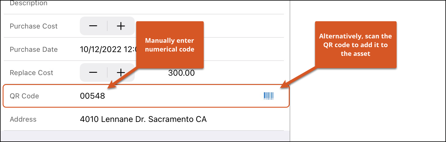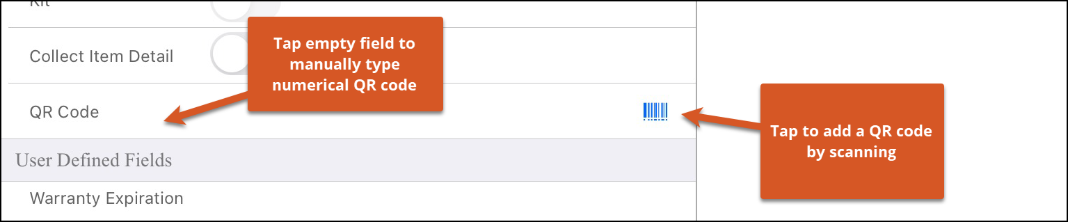 - Touch the barcode icon to scan a QR code and attach it to this item.
