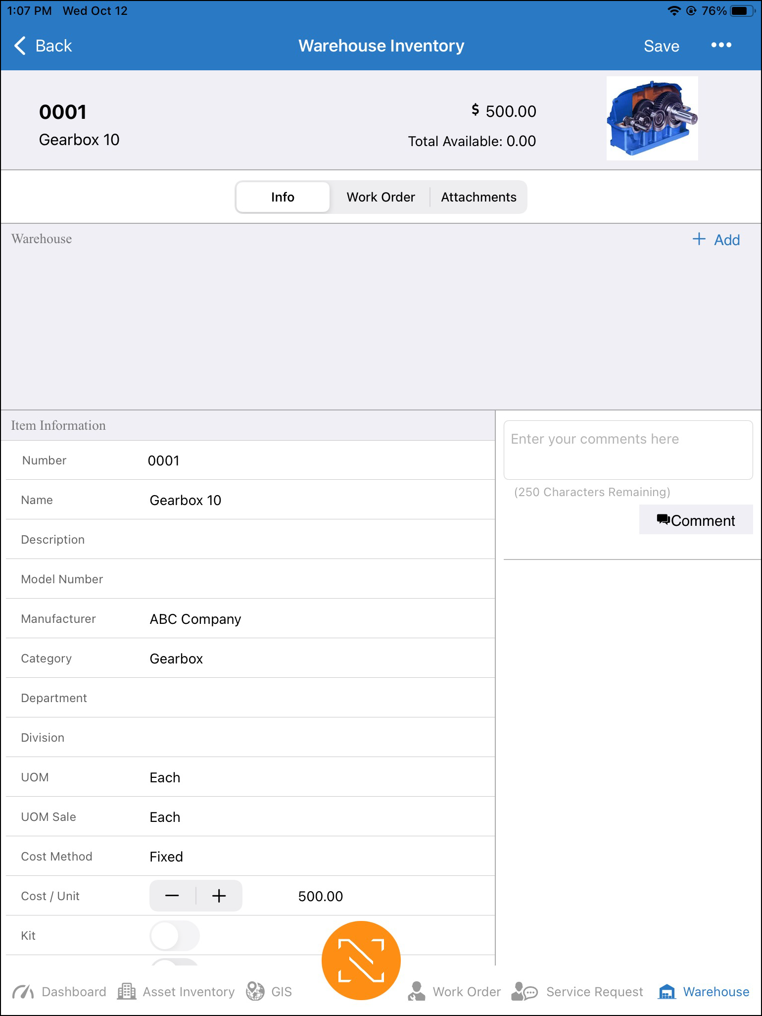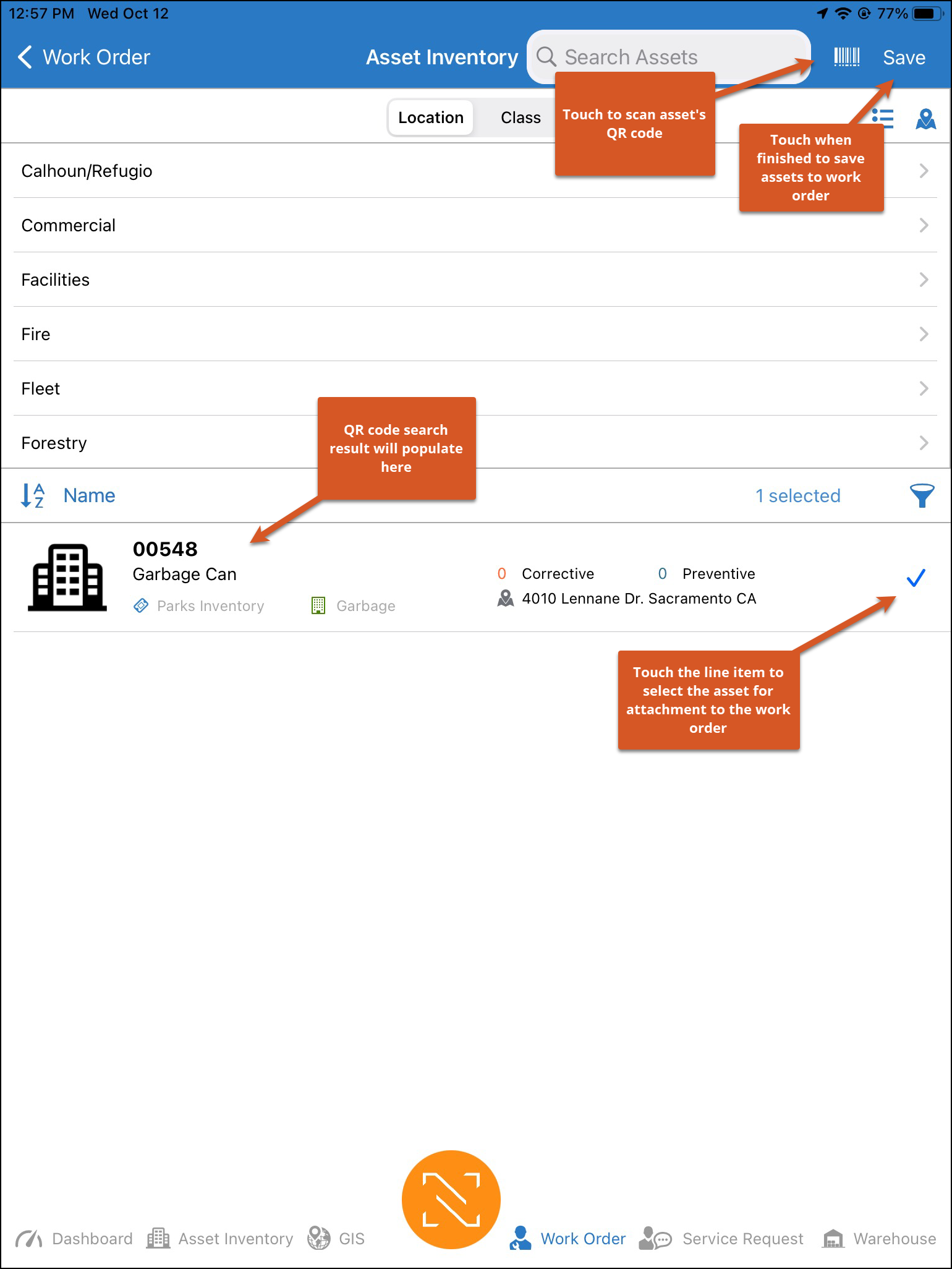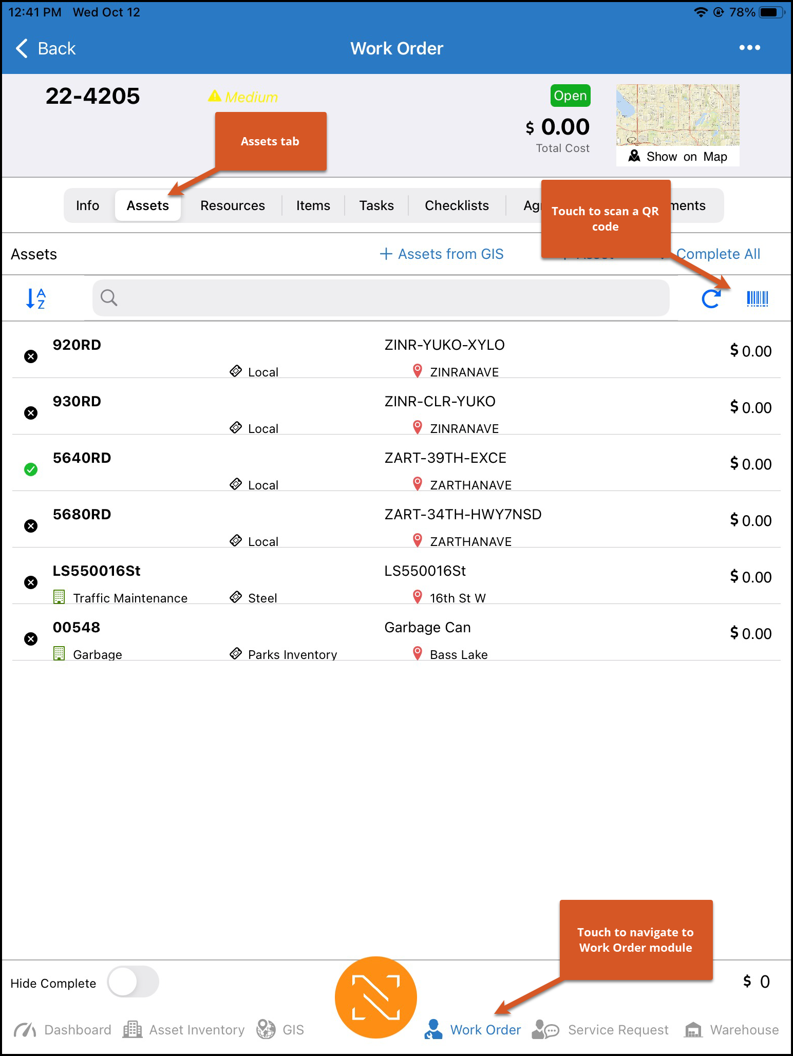 In addition to the Asset Inventory module, QR codes can be found in the Work Order module. These can be used to quickly add assets to a work order or to search for assets attached to a work order, which is especially useful if you have a sizable list of assets to look through.