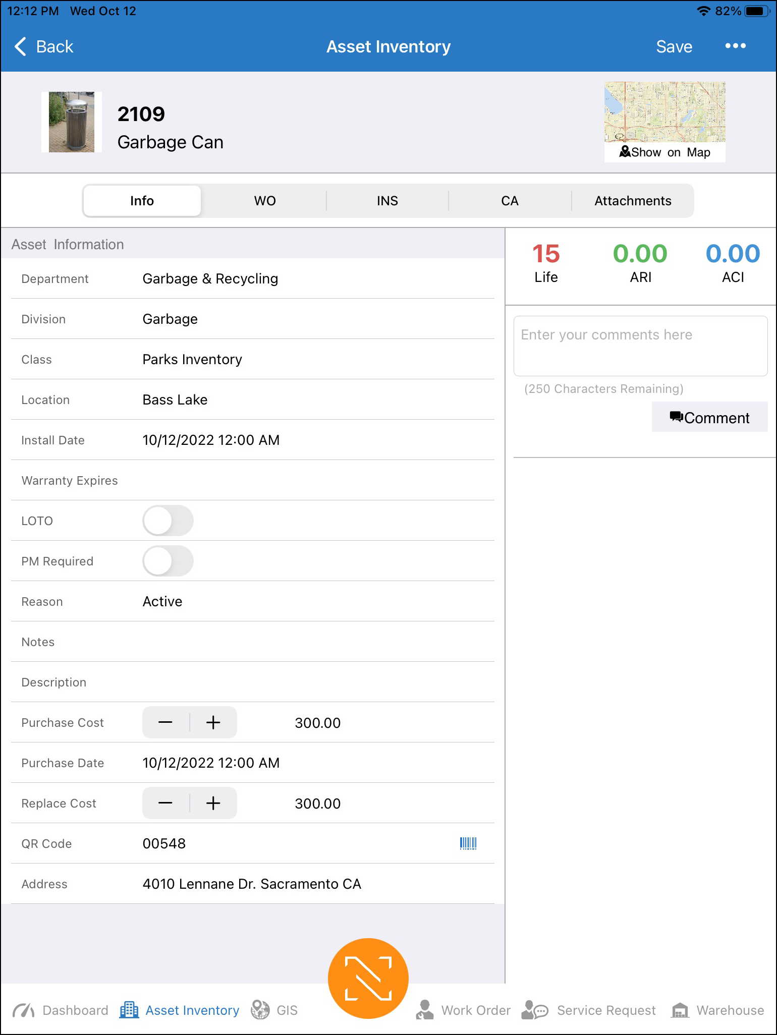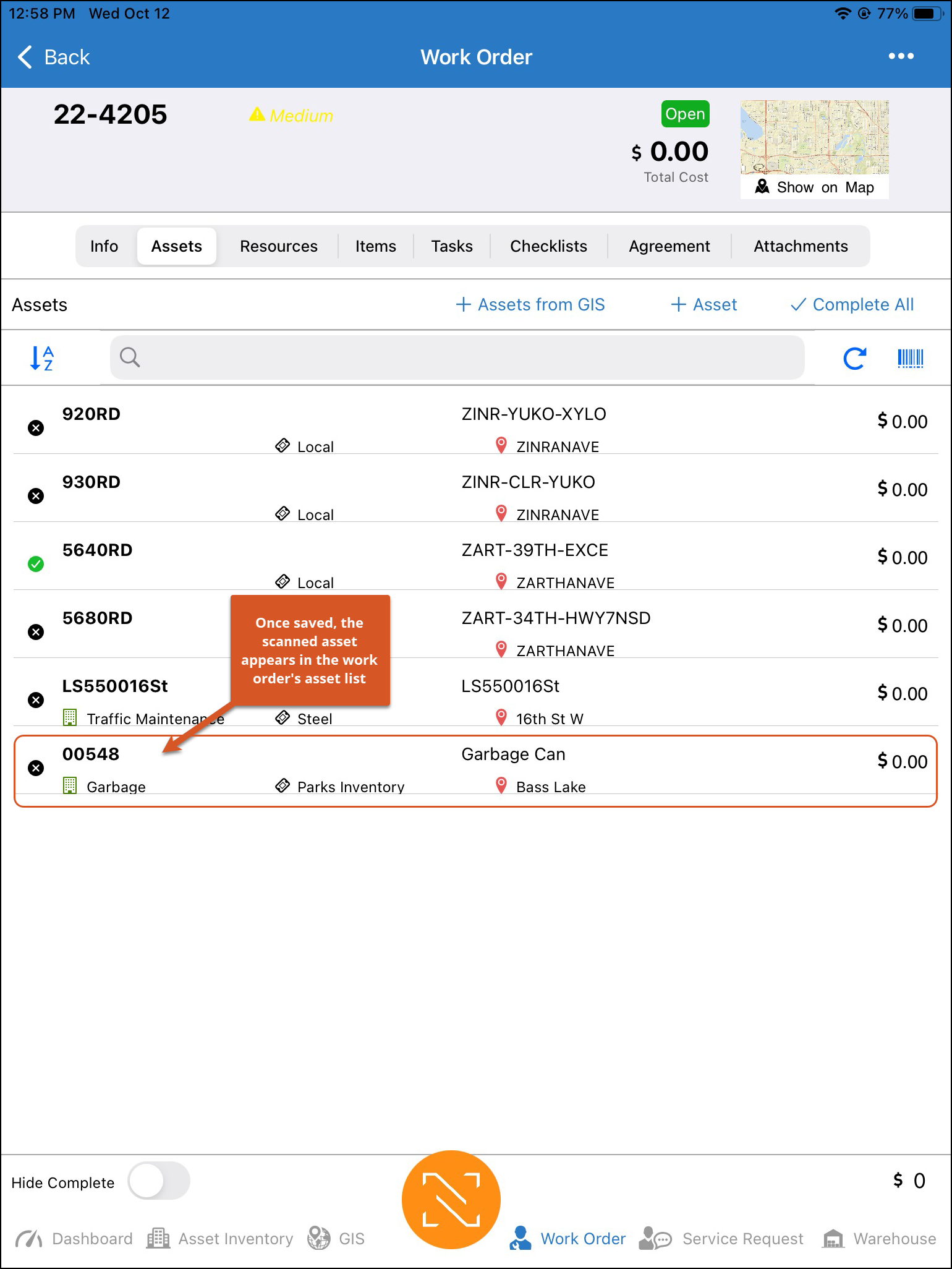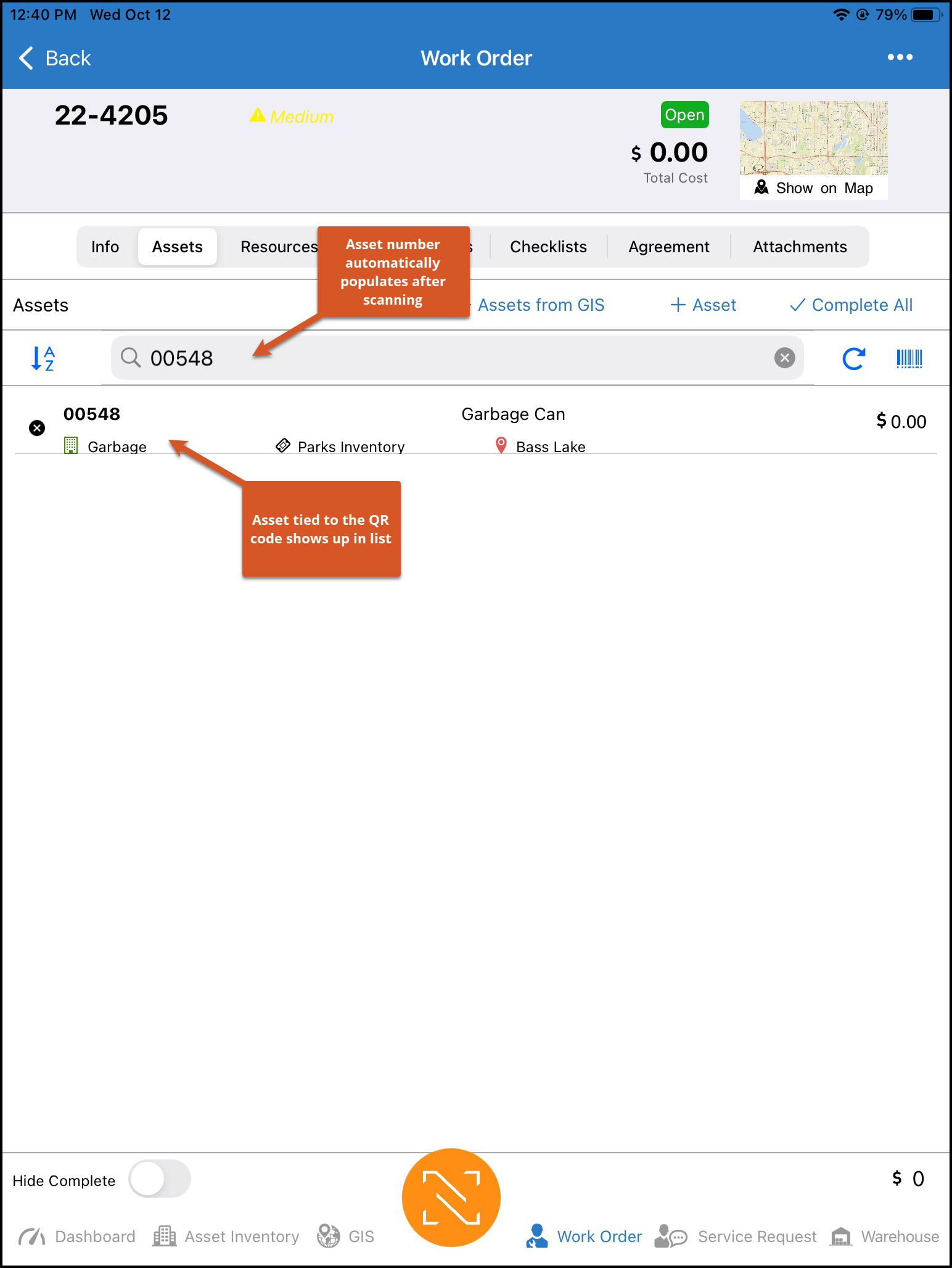 Once an asset is tagged with a QR code, you can scan that QR code to pull up the asset's record instantaneously. This is useful for when you are working in the field. To quickly pull up an asset record using QR codes: