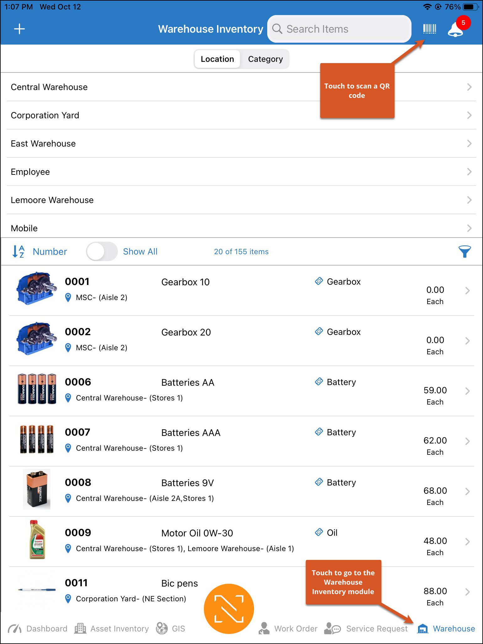 - Navigate to the Warehouse Inventory module by touching "Warehouse" at the bottom of the screen.